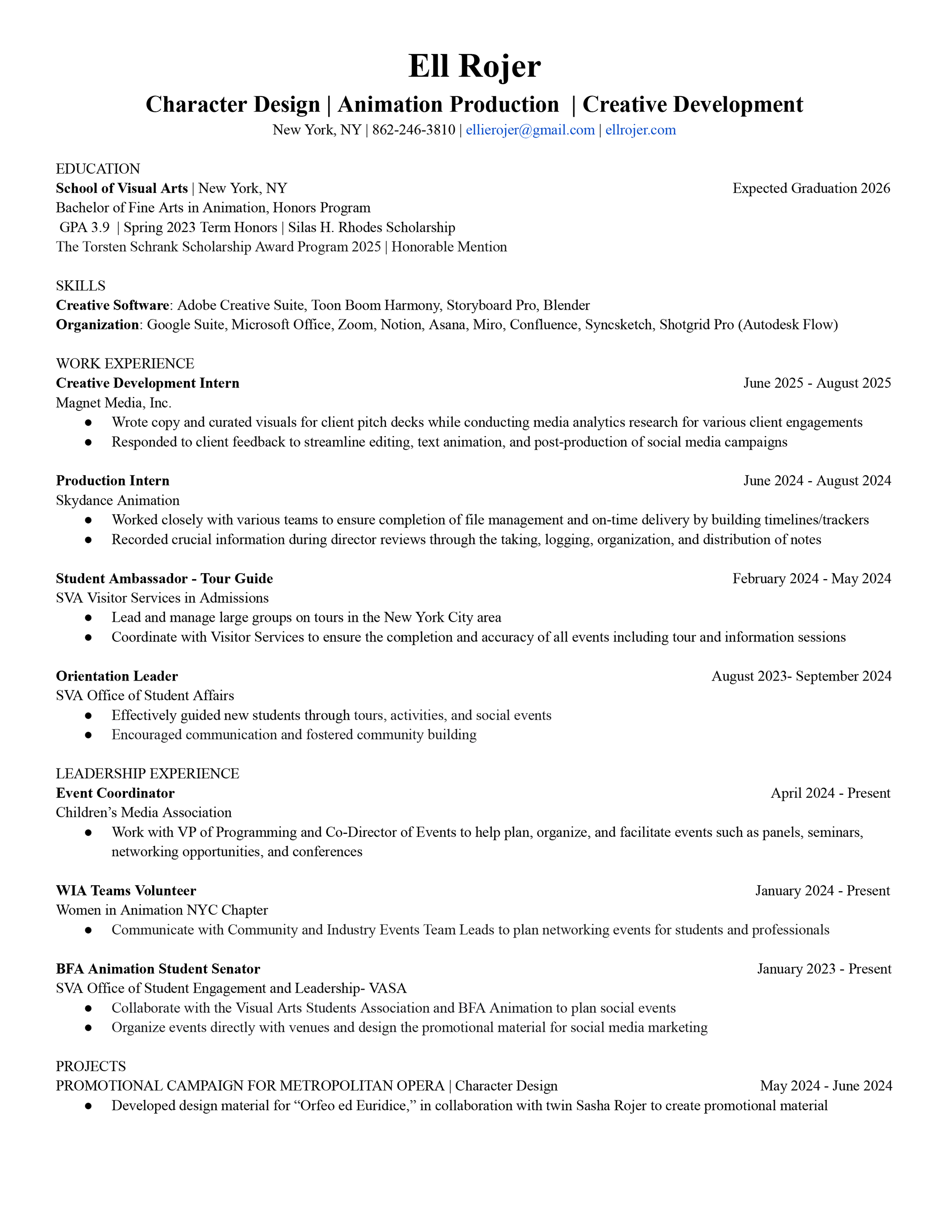 ✩‧₊˚ Ell Rojer is currently studying 2D Animation at the School of Visual Arts, with a focus in character design and production. She excels at creating vibrant characters that bring stories to life, as well as building strong pipelines that support the artists working within them. When not working, you can find Ell working out, practicing handstands, or reading a psychology book! ✩‧₊˚